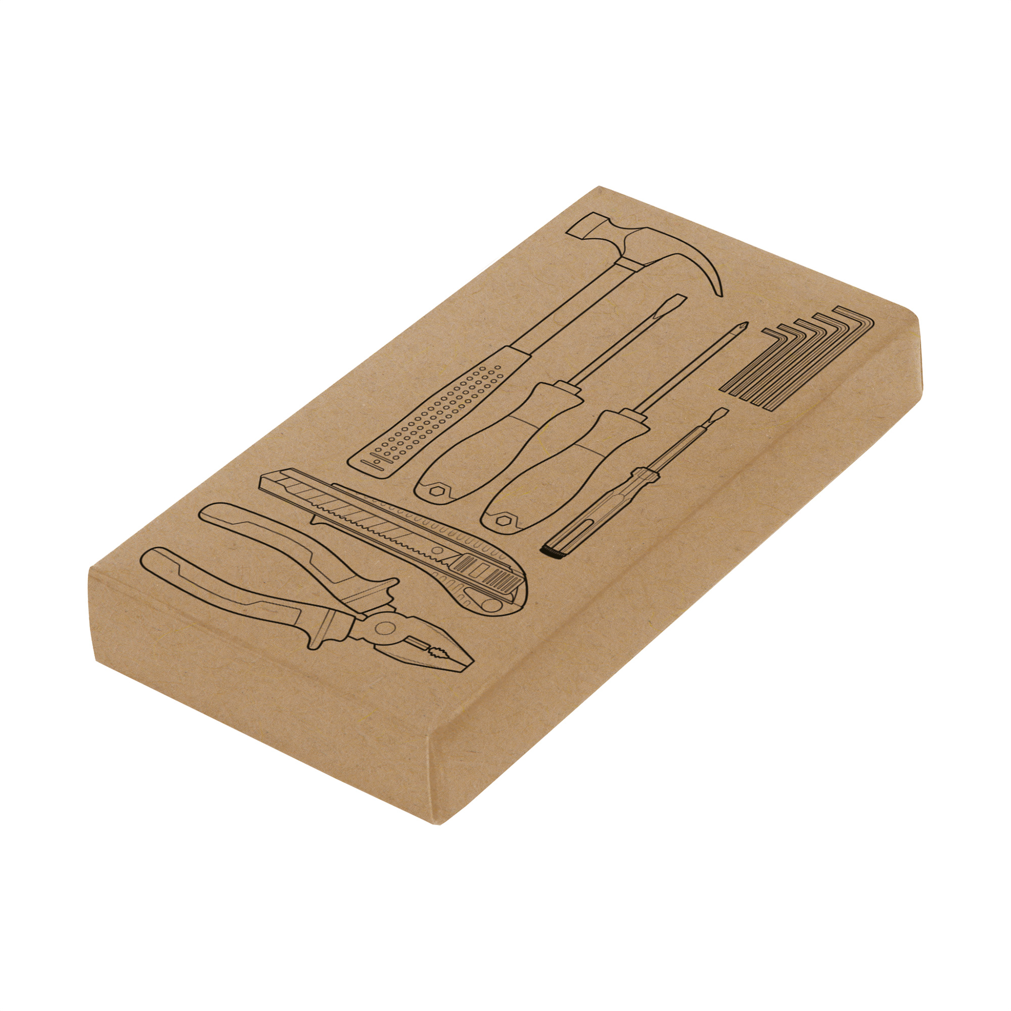 Set de herramientas. Contiene 11 piezas: 1 juego de 5 llaves Allen hexagonales (2, 3, 4, 5 y 6 mm.), Cutter profesional 18mm. con seguro, 2 destornilladores con diferentes puntas de 5mm (plana y phillips), 1 destornillador tester buscapolo (100-500V), martillo de uña 23 mm. y 1 pinza alicate universal 165 mm. Todas las piezas están sujetadas con elastico en estuche portable de poliéster 600D.